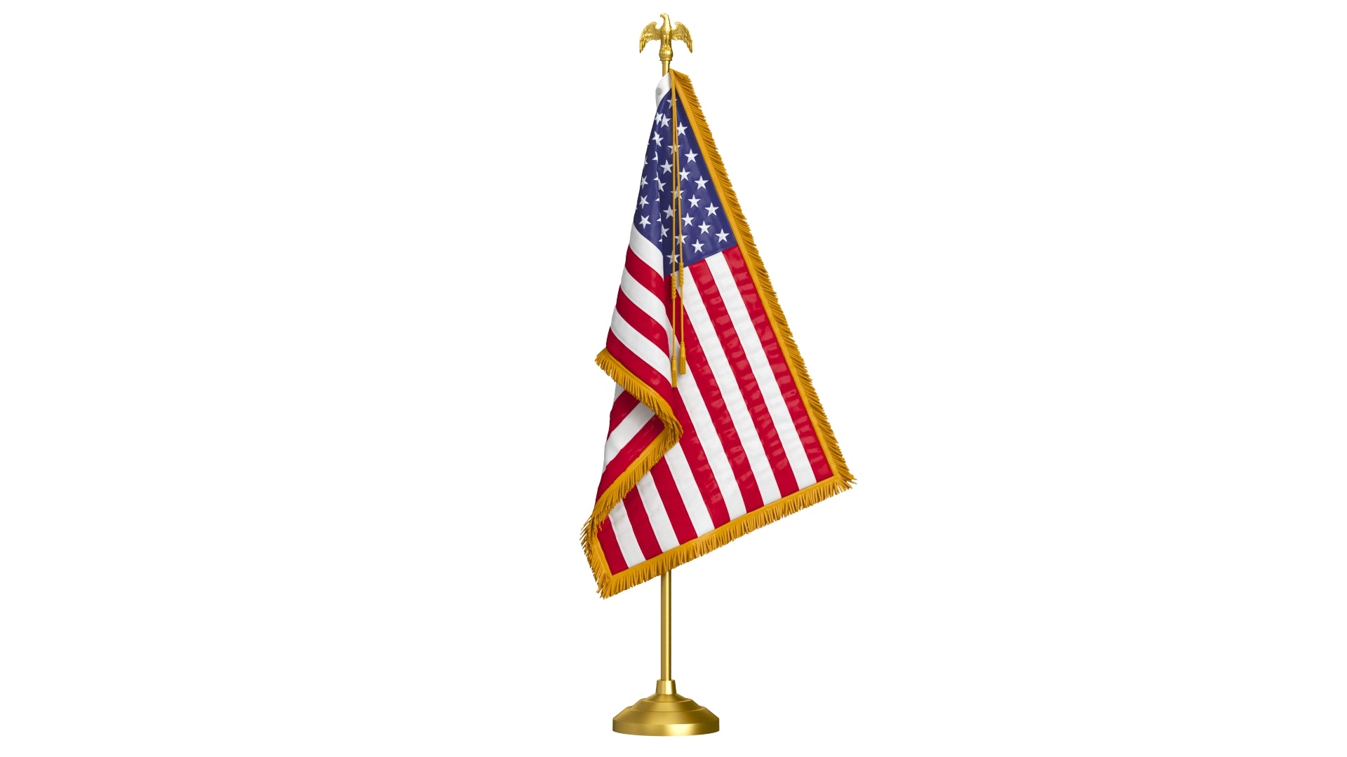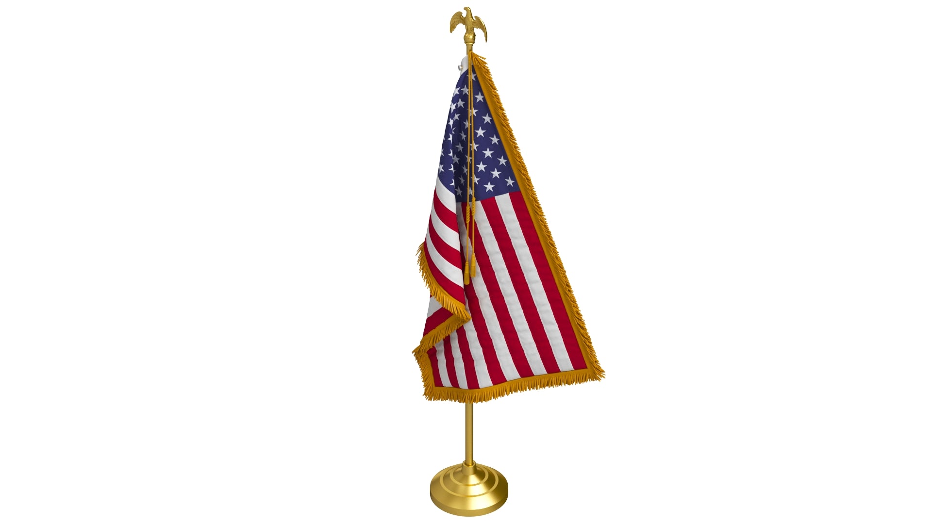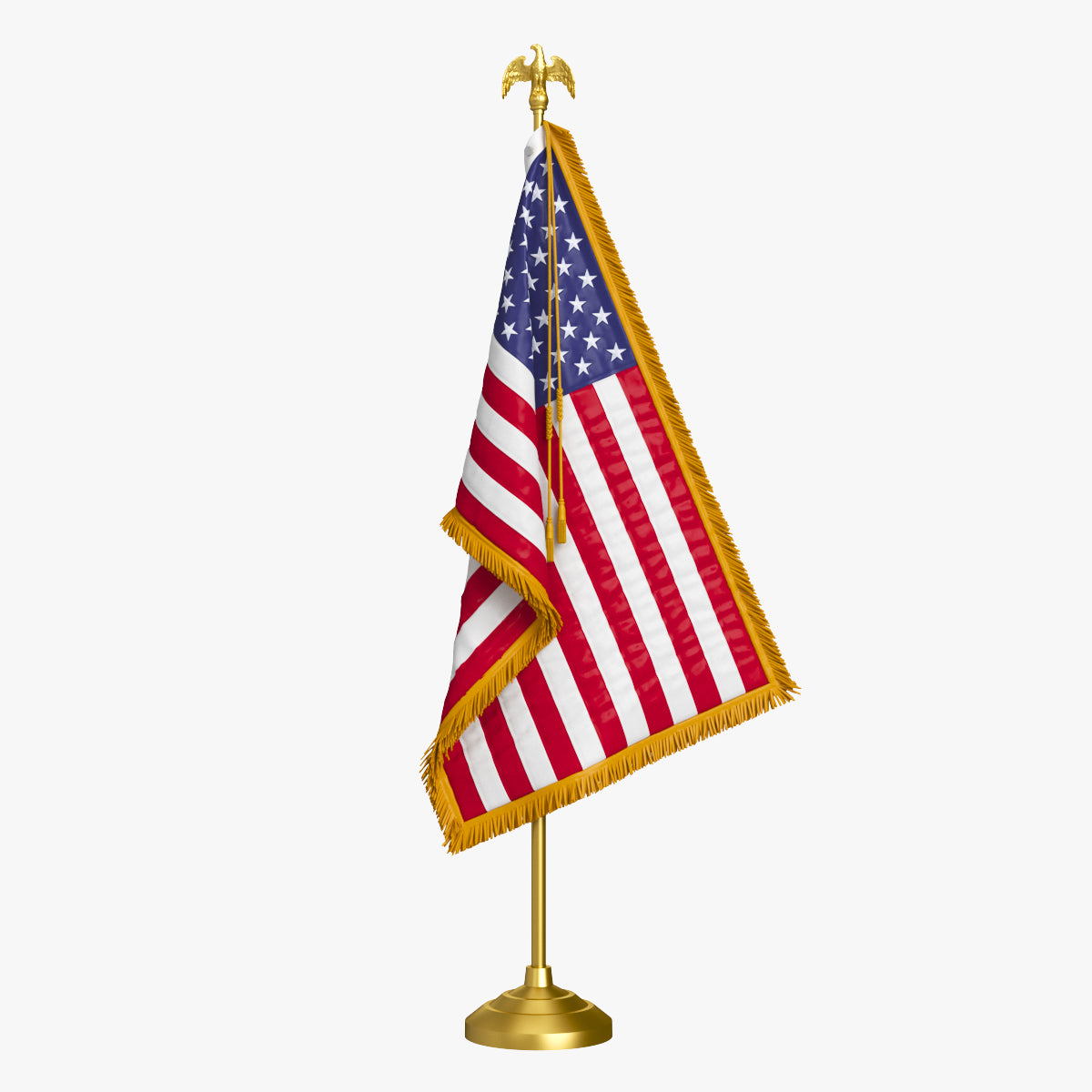American Table Flag with Pole Eagle Topper is a high-quality, photo-realistic 3D model that adds detail and realism to any rendering projects. The model has a fully textured and detailed design, allowing for close-up renders. It was originally modeled in 3ds Max 2016 and rendered with V-Ray. Renders do not undergo any postprocessing.